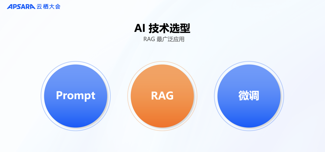AI 落地场景 是不是所有的业务都能用 AI 解决呢?目前看不是的。那 AI 适合做什么场景呢?目前看,适合容错性高、结构化强的场景。我们在做开源社区的时候发现社区的 Issue 非常多,但是无法响应开发者需求,因此我们想如果构建一个 AI 答疑专家,帮助开发者解决场景问题,构建新型开源社区协作模式,这个就非常有价值。因此我们落地第一个场景是 AI 答疑专家,解决开源社区答疑问题,提升开源社区活跃度。 AI 技术选型 我们在技术上有三个技术选型 :Prompt / RAG / 微调。