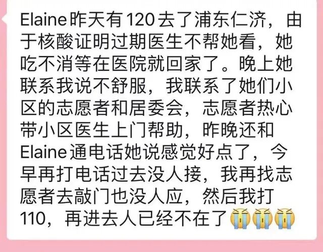 然而这鲜活的生命,在2022年4月1日下午,当120把她紧急送到仁济东院后却因封闭小区统一做的核酸报告刚过期几小时被拒诊,于4月2日凌晨猝然离世。