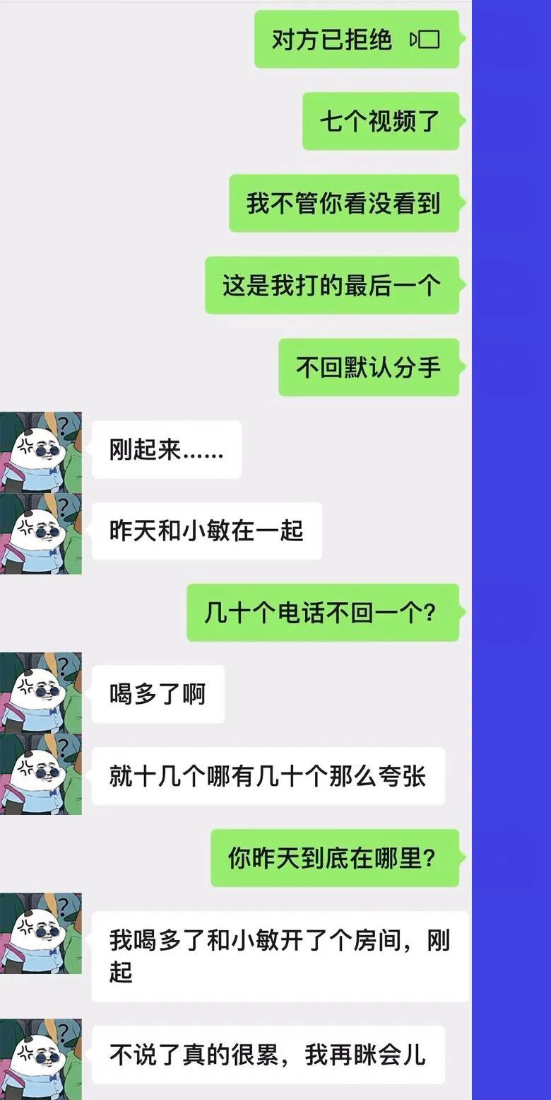 就这样过了一晚上,我几乎一直抱着手机没睡,眼睛都红了,每隔一个小时打一个视频电话,都挂了,一直到早上七点多我打了最后一个视频,依然被挂,我跟她撂了狠话。