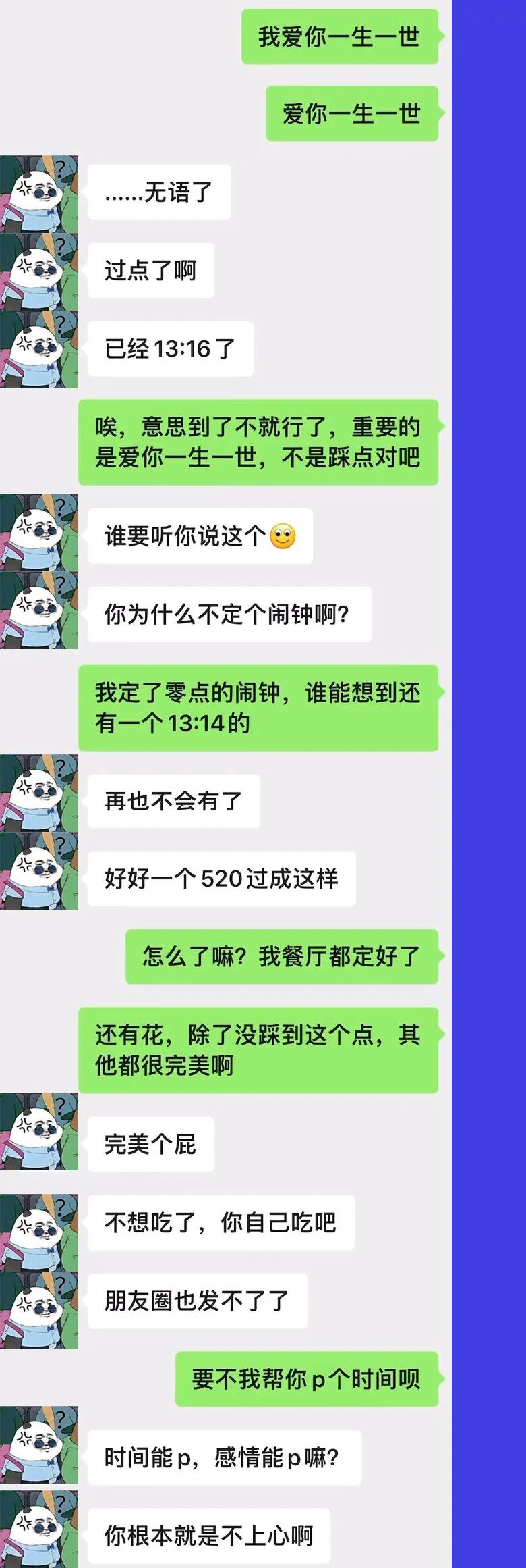 结果就因为13点14分忘了发“我爱你一生一世”,看她臭脸一整天。