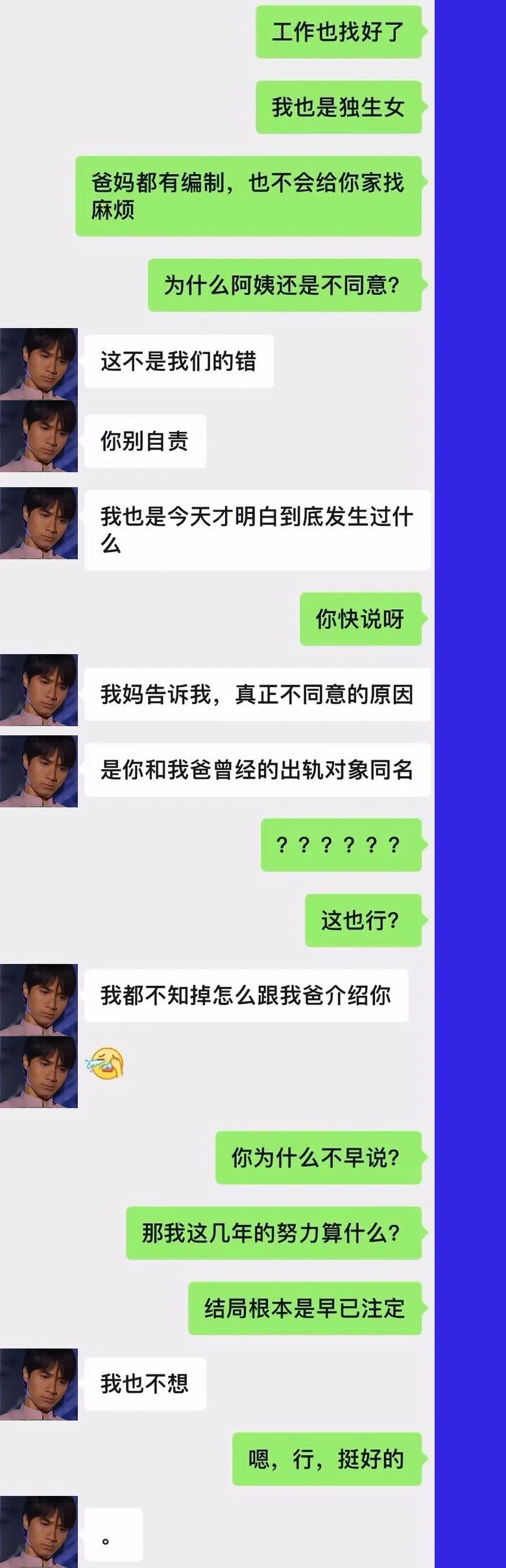 他和我说,他们家里人不同意,他和我分手的真正原因,是因为我和他爹婚内出轨对象同名,他不知道怎么和他家里人介绍我。