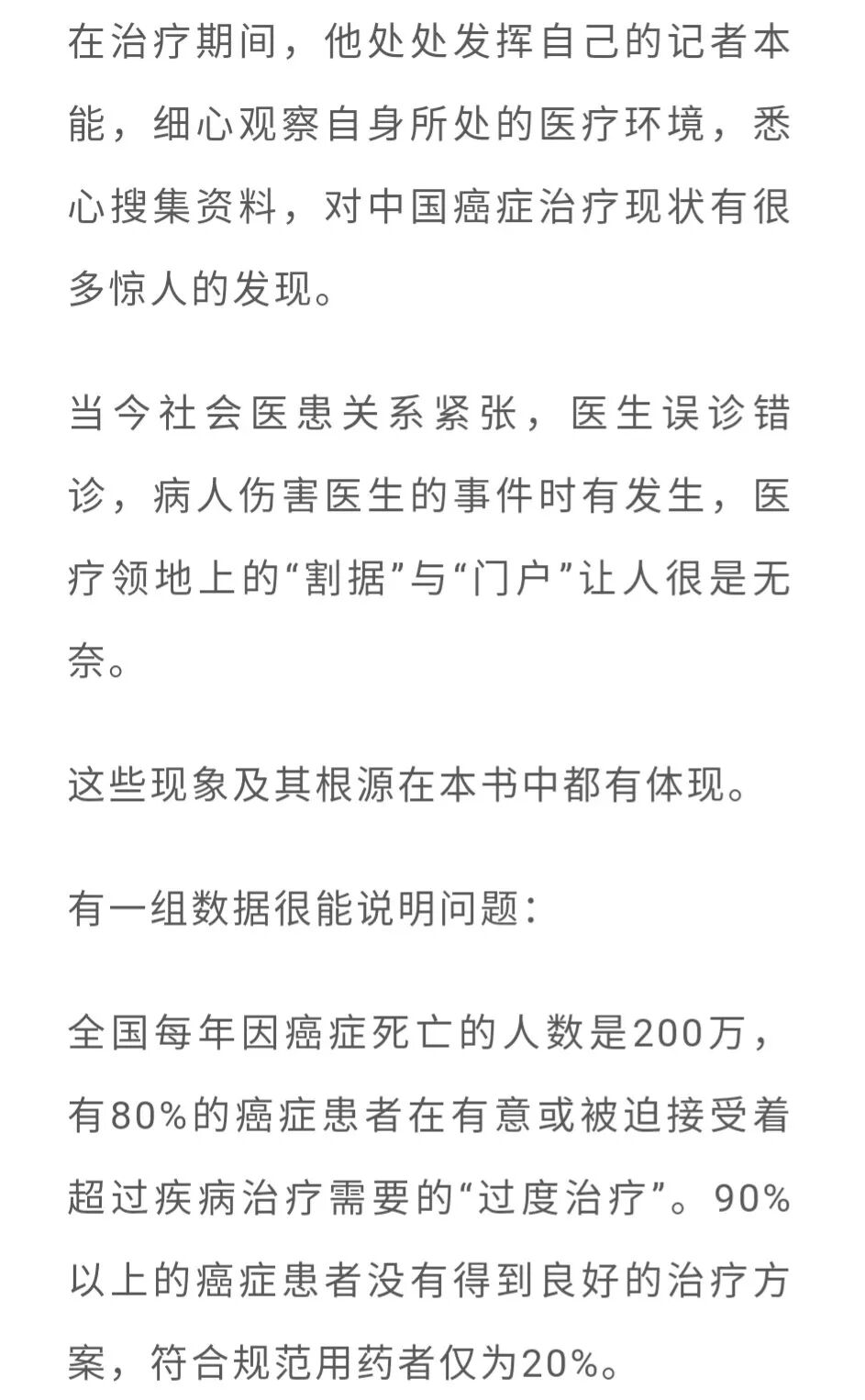 这本书包含了他五年抗癌康复之路上的经验总结,如实记录了犯过的错误,堪称一部“生病智慧书”;也书写了一位资深记者对当今中国癌症医疗体系种种利弊的观察和剖析,观点犀利。