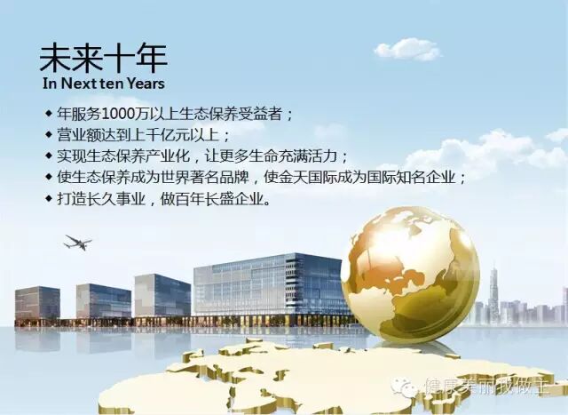 事业源于积累,成功始于规划。金天国际于1993年制定了30年战略规划,第一阶段开创期,完成 原始积累,企业资产突破一亿元,1997年实现两亿两千万,开创期圆满结束。第二阶段巩固期,完成企业核心技术的完善,建立现代企业管理机制和全新商业模 式,经十年研发,现已拥有生态保养,生物气波等国际尖端的养生技术及几十项专有专利技术,2008年在新加坡组建金天国际集团总部,标志着企业拉开国际化 运作的序幕。与此同时,全新的商业模式逐步成熟完善,企业巩固期完美落幕。自2013年起,金天国际开始进入冲刺产业化的全速发展期,决心用十年的时间, 使企业年营业额达到1000亿元以上,成为世界知名企业和国际著名品牌,实现生态保养产业化。