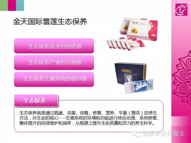 金天国际经20余年的研发,现已独家拥有国际领先的生态保养和生物气波两大健康专利技术,并先后 研发出生态保养、生物气波、洗浴养生、雪莲天然化妆品、本源养生、专项健康护理六大系列、30余款产品,主导产品男女生态保养品由10万级无菌净化车间, 全自动生产线一次成型,国际先进透皮吸收、定向导入技术力保功效持久。在疏通、改善微循环,杀菌、平衡菌群,排毒、洁净内在,修复、增强防御功能,营养、 平衡激素,激活、充满活力的科学养生方案指导下,通过综合治理、系统修复和整体提升,实现了让生命充满活力的目标。