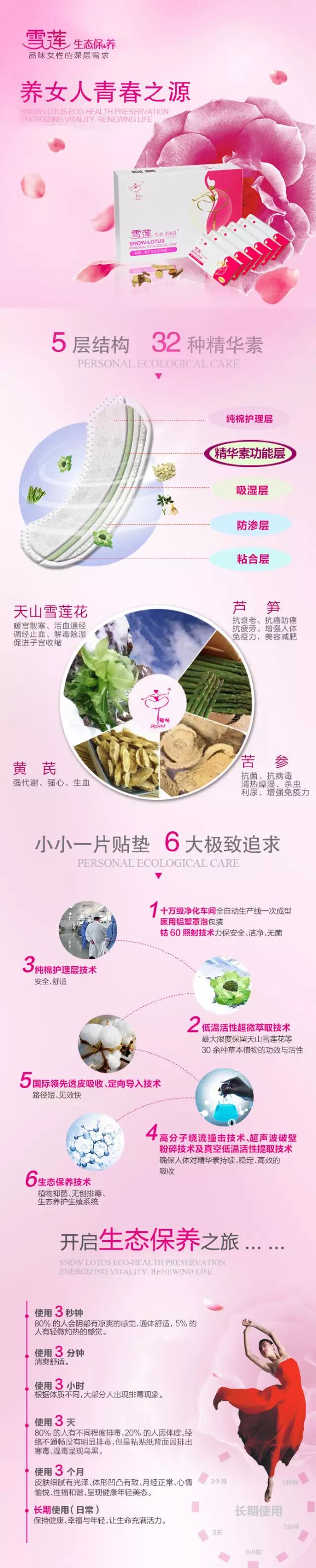 全球独一无二,不用搽,不用抹,不用塞,不吃药,不打针,专利技术采用低温萃取三十几味纯中药提取精华素,非抗生素杀菌 ,无创排毒。轻松一贴,简单 方便,解除生殖疾病的烦恼。 通过六位一体疗法,疏通, 杀菌 , 排湿,排毒, 营养 补肾气, 激活,再生,使你的根部保养年轻5-10岁 ,干干净净,轻轻爽爽,告别异味,唤醒天然体香 ,性福一辈子。雪莲生态保养贴安全无毒副作用,0-100岁都能用!