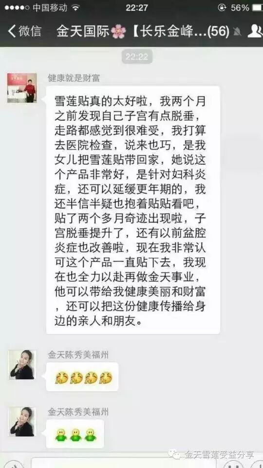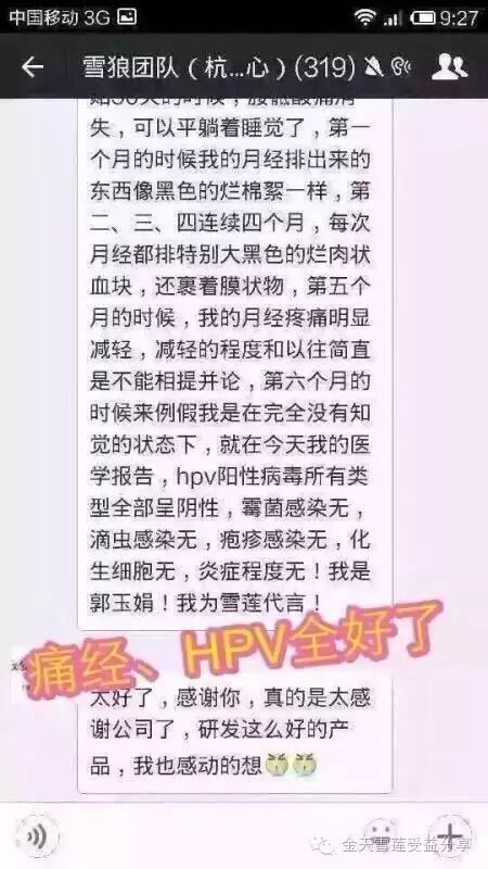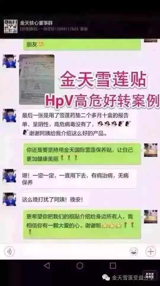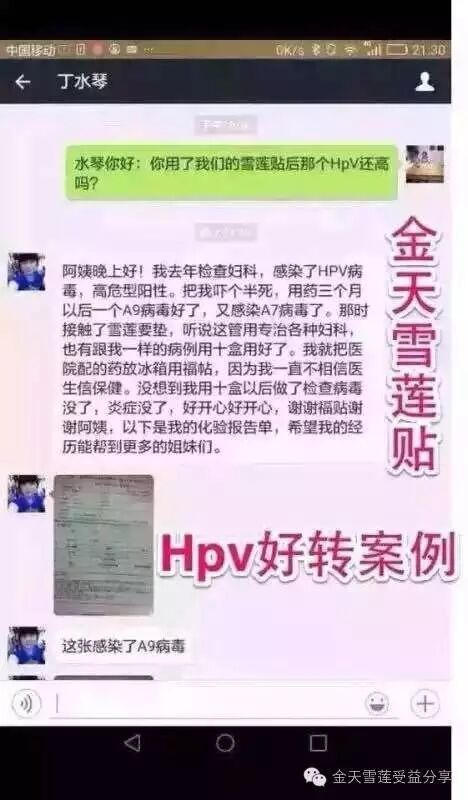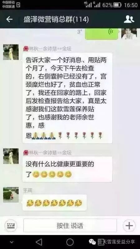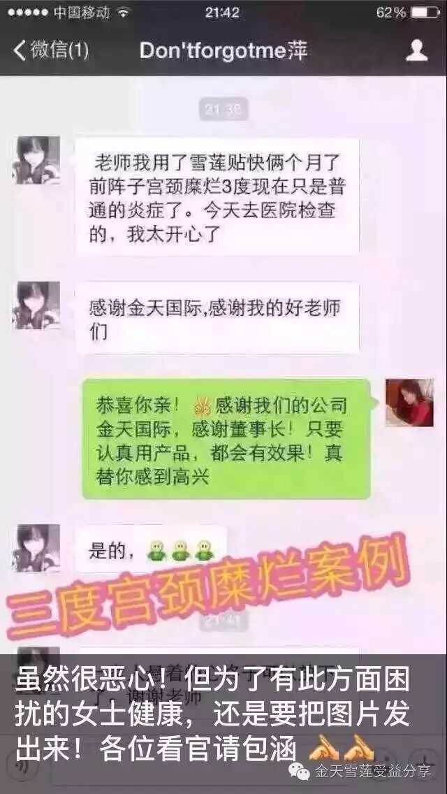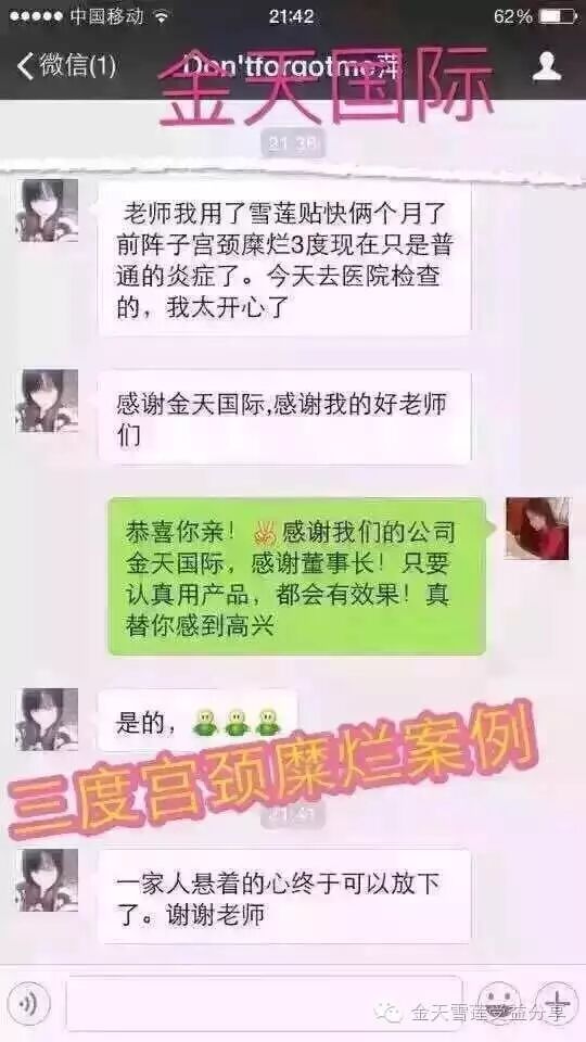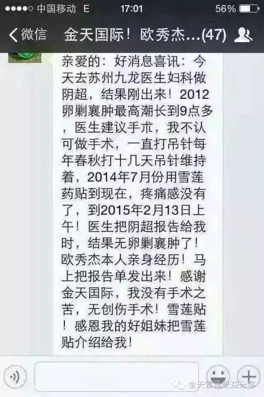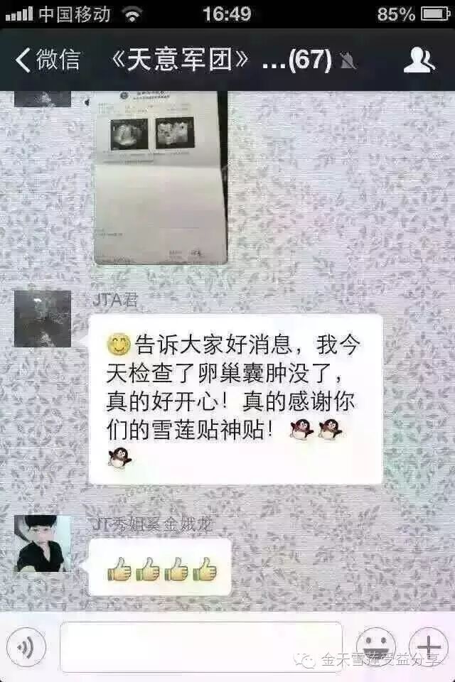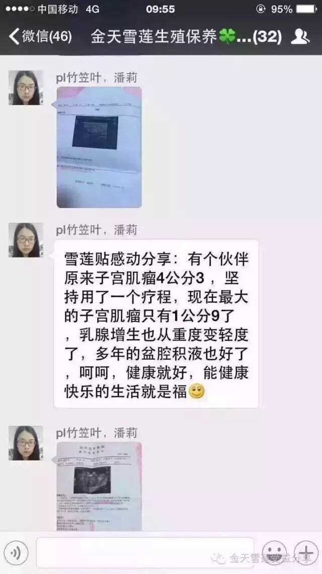 她,子宫肌瘤6.2公分,去医院做了手术3个月后又疼痛难忍,去医院做B超发现由原来的1个6点2公分的瘤子割除后变成了3个,悲愤交加,痛苦不止,这个时候好朋友王双梅老师把雪莲贴介绍给了她,她用了4个月以后去医院做彩超,医生问她多大年龄了,她说我4O多岁了,医生非常吃惊的说你的子宫特别光滑特别柔软特别干净象2O多岁女人的子宫,她听了后非常开心留下了高兴的眼泪,雪莲贴谁用谁知道、谁用谁受益。