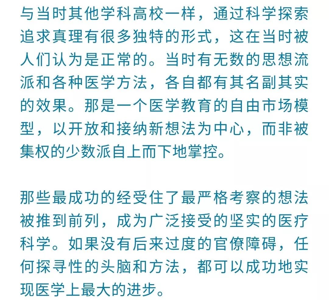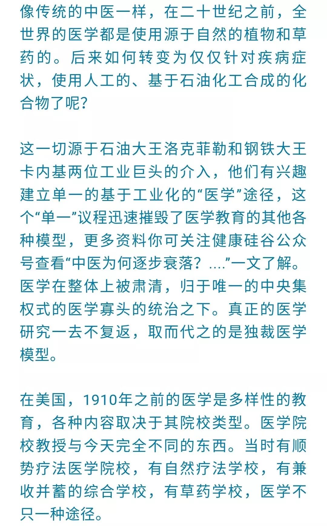 1910年,由洛克菲勒和卡内基赞助出版的《弗莱克斯纳报告》组织了一场对全北美155家医学院校遗漏删节方式的评估,有效地操纵公众舆论,将美国原有的医学教育形式丑化为破碎的、需要修补的,从而抛弃之。