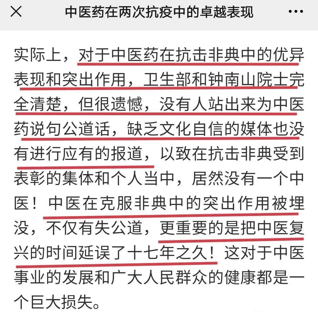 2021年8月6日凌晨02:07,人民日报社四川分社社长林治波亲自发文,指出中医药在非典时的贡献被卫生部和钟南山掩盖,中医复兴被延误了17年,对于中医事业的发展和广大人民群众的健康都是一个巨大损失。