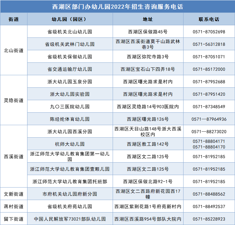 3. 西湖区教育局幼儿园招生咨询电话:0571-87965077。