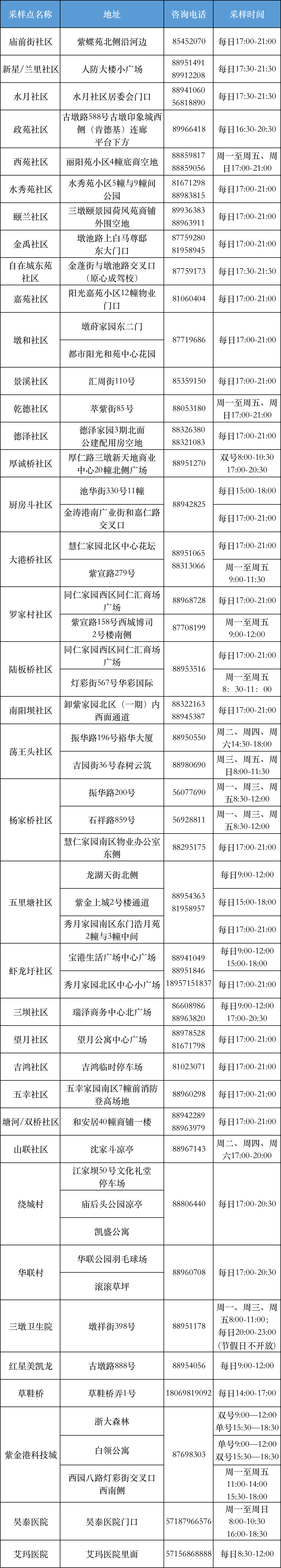 杭州常态化核酸检测频次从7天调整为72小时,自7月13日零时起开始扫码查验。三墩镇各对外核酸检测点位的最新信息公布如下,请大家在规定时间内就近前往采样。