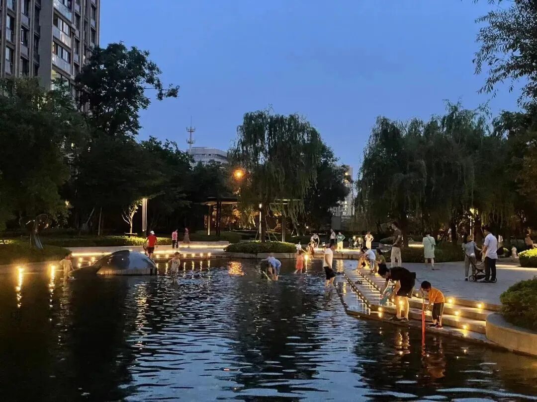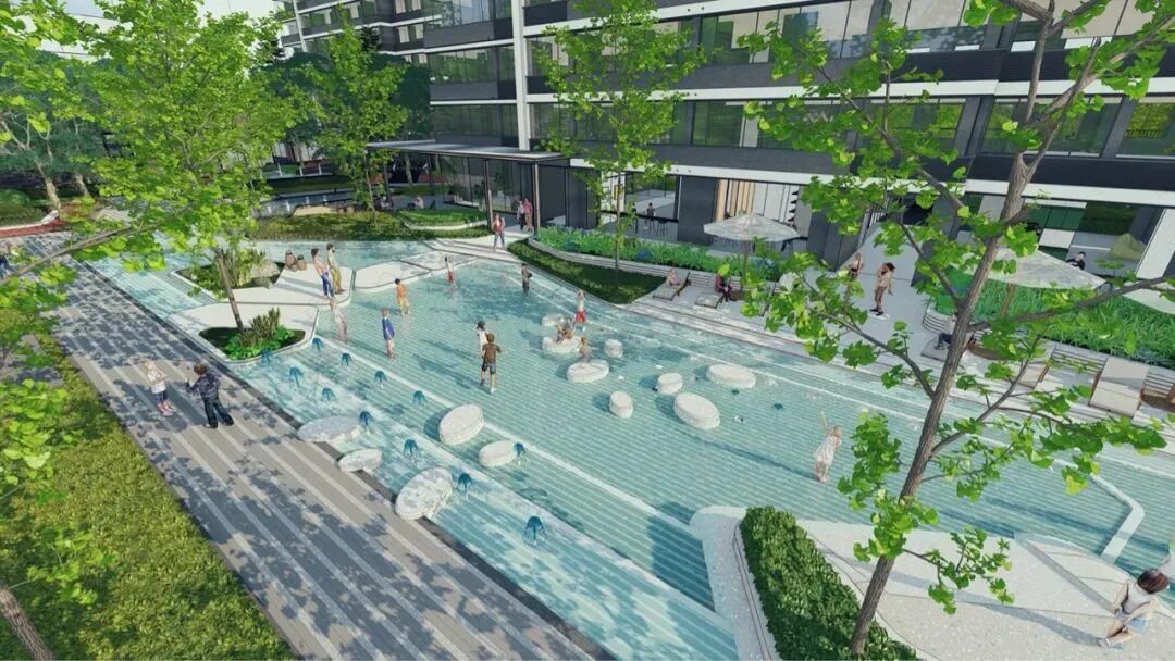比如在园区的景观互动上,设计师们也是充分调研了当下市场上的设计形式,并没有将其打造成为传统的景观水系或者维护成本较高的室外泳池,而是将水景做浅做平,以无围栏式的设计形式加强后期业主们之间的交流与互动。
