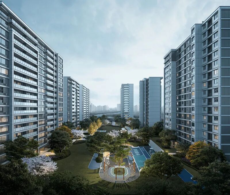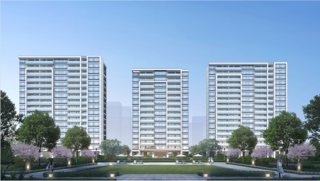 水系萦绕的庭院,与东南两侧的L型天然河道呼应;前后楼幢的一字型平行排布,留出了约1.5万㎡围合式园林,仅中央景观带就超过6000㎡,户户都能坐览好风景。