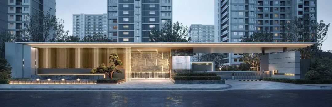 其次是豪气的景观园林,30多米宽的酒店式小区门头,尽显大宅风范;入口处的格栅景墙,营造出影影绰绰的中式照壁效果;人行与车辆,也在此实现分流。