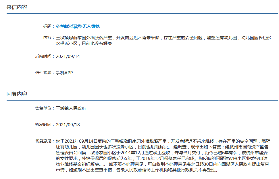 已经向我们的镇政府,我们的上级部门先反映这个情况,区、镇两级都已经向市里反映了情况,毕竟这个外墙脱落安全隐患也蛮大的,也想能不能有一个比较妥善的解决办法。
