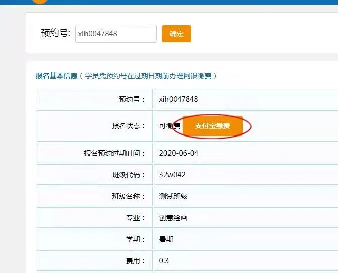 登录“网上报名系统”→点击右上角“已报班级列表”→核对班级信息后点击“缴费”→“支付宝缴费”。
