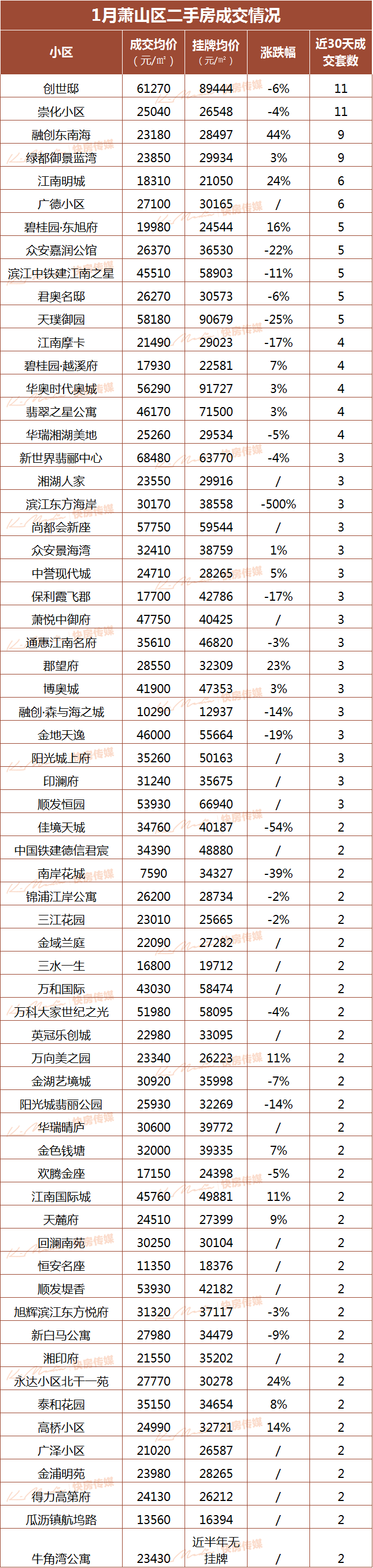 三墩天地整理了1月份,杭州各区二手房成交量及涨跌情况。