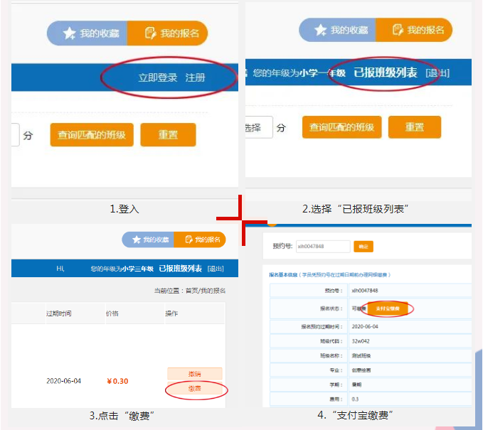 登录“网上报名系统”→点击右上角“已报班级列表”→核对班级信息后点击“缴费”→“支付宝缴费”。