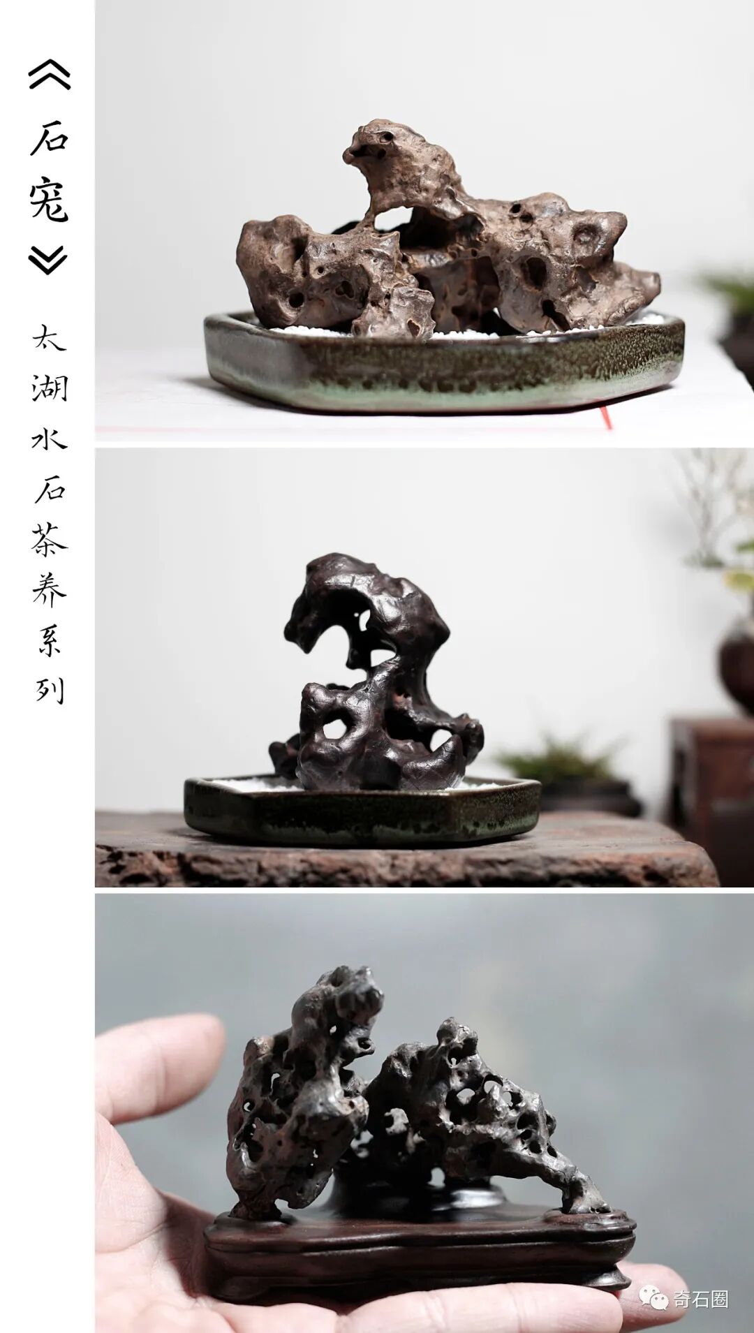 谈起多年玩石的经历,先生感触颇多。从最初为了植蒲而用吸水石雕刻太湖石形态,渐渐地对太湖石欲罢不能,从此进入了传统赏石的推广行列中。先生之前从事设计工作十余年,所以对赏石也有不少独到的见解,这让他在推广中更能受到石友青睐。为了让石头的配座能更符合自己的设计构思,先生决心自己亲自配座,甚至设计制作出挖木槽的机器。此外还推出了“石宠”的赏石概念和茶养小水太湖石的方法。而且皆被众多爱好者所接受和效仿。