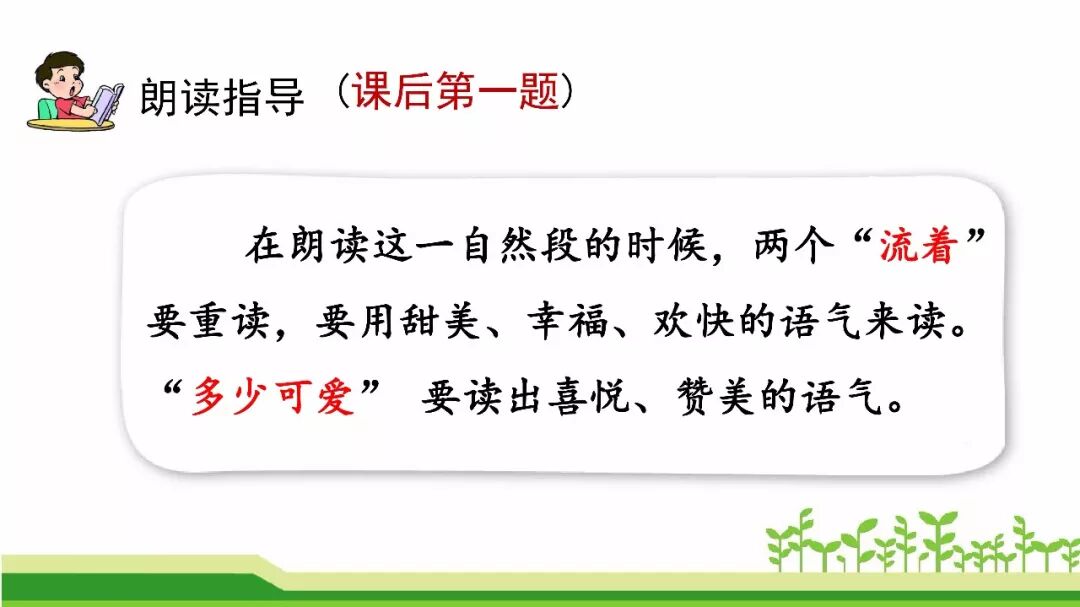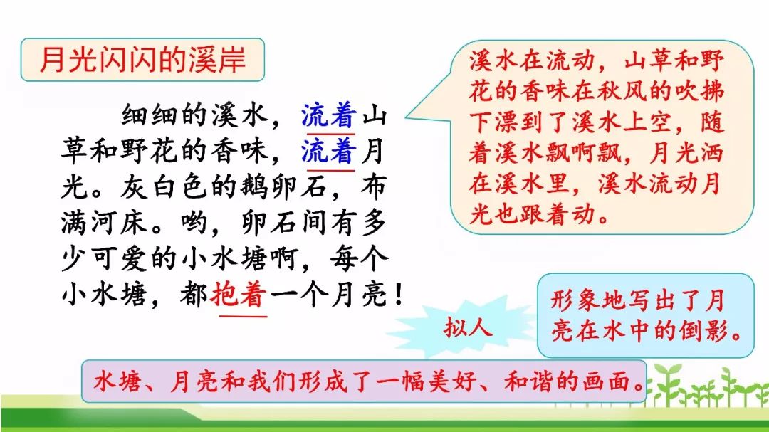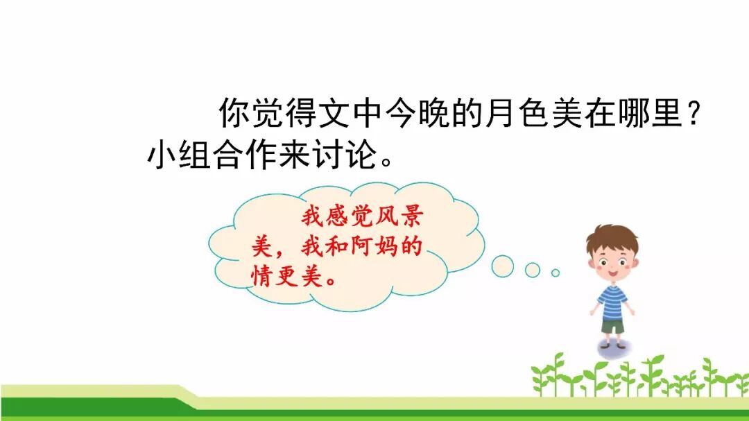 2.阿妈牵着我的手走过“月光闪闪的溪岸”,“细细的溪水、流着山草和野花的香味,流着月光……”你的头脑中浮现出怎样的画面,课文中还有那些地方给你留下了深刻的印象,和同学交流。