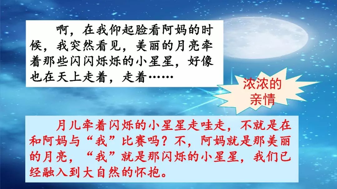 这句话看似重复,实则妙笔之句,充分表达了小作者和阿妈走月亮时无比幸福和喜悦之情。细细咀嚼这种情致,意趣,虽是秋夜,却让人心中涌起融融的暖意。