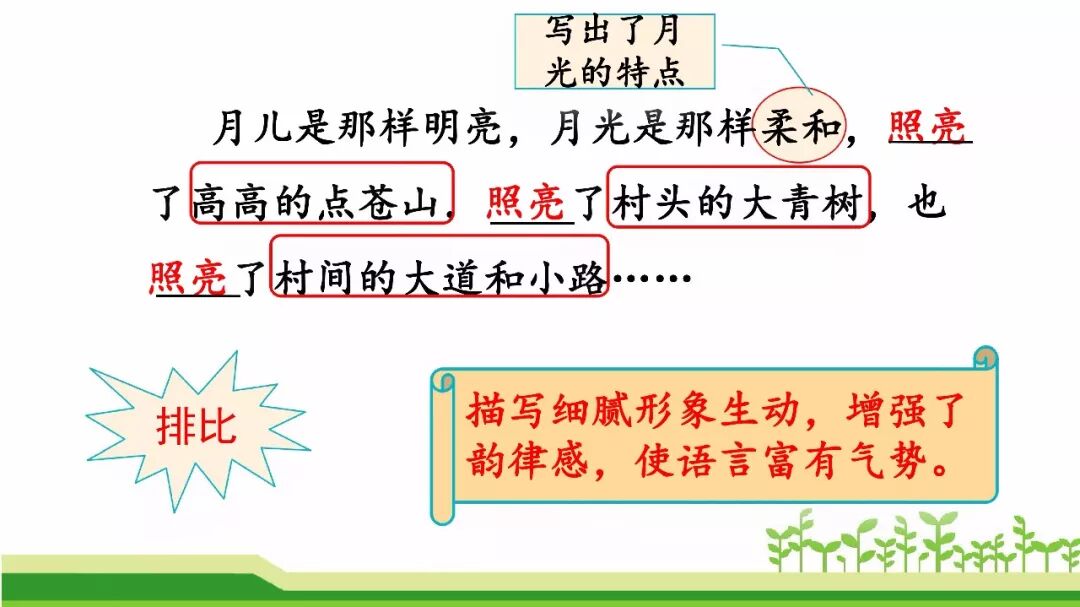作者运用排比的修辞手法,选取了明月、点苍山、大青树、乡间的路等自然景物,生动形象的描绘出了一副山村月夜图。写出了着迷人的月夜使我和阿妈感受到了月色的美好,为我们创设了一个静谧、美好、祥和的境界。