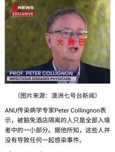 对于新州政府的严重渎职,ANU传染病专家Peter Colingnon却袒护称,据他所知,被豁免隔离的人斌没有导致任何一起感染事件。这种表态,本身就不具科学性。据他所知?那还有他不知道的呢?这年头井底之蛙还是少吗?自以为是的专家还少吗?又或者是知道数据却故意隐瞒,掩饰新州政府的过失?这样的大嘴巴,还好意思挂上“传染病专家”的头衔?说话不负责任的专家应该闭嘴!