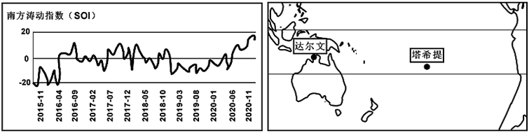 科学界一般利用太平洋塔希提岛与澳大利亚达尔文两地(下图)的海平面气压差值(Pa塔-Pa达)来表征全球气候的变化,称为南方涛动指数(SOI)。当SOI为负值,对应厄尔尼诺现象,当SOI为正值,对应拉尼娜现象。据此完成下列各题。