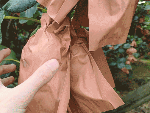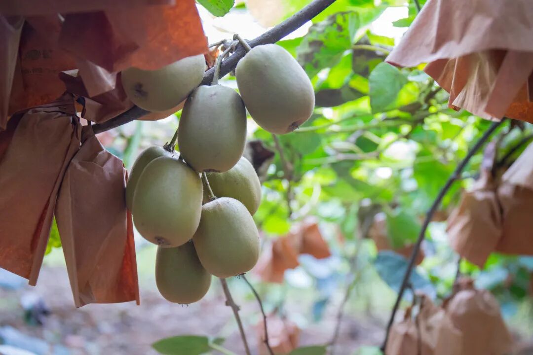 猕猴桃娇气得很,喜光又怕晒,所以果农门就会在结果之后给每个猕猴桃套上纸袋,这样可以减少太阳的强烈的直射,也可以更好地防虫。