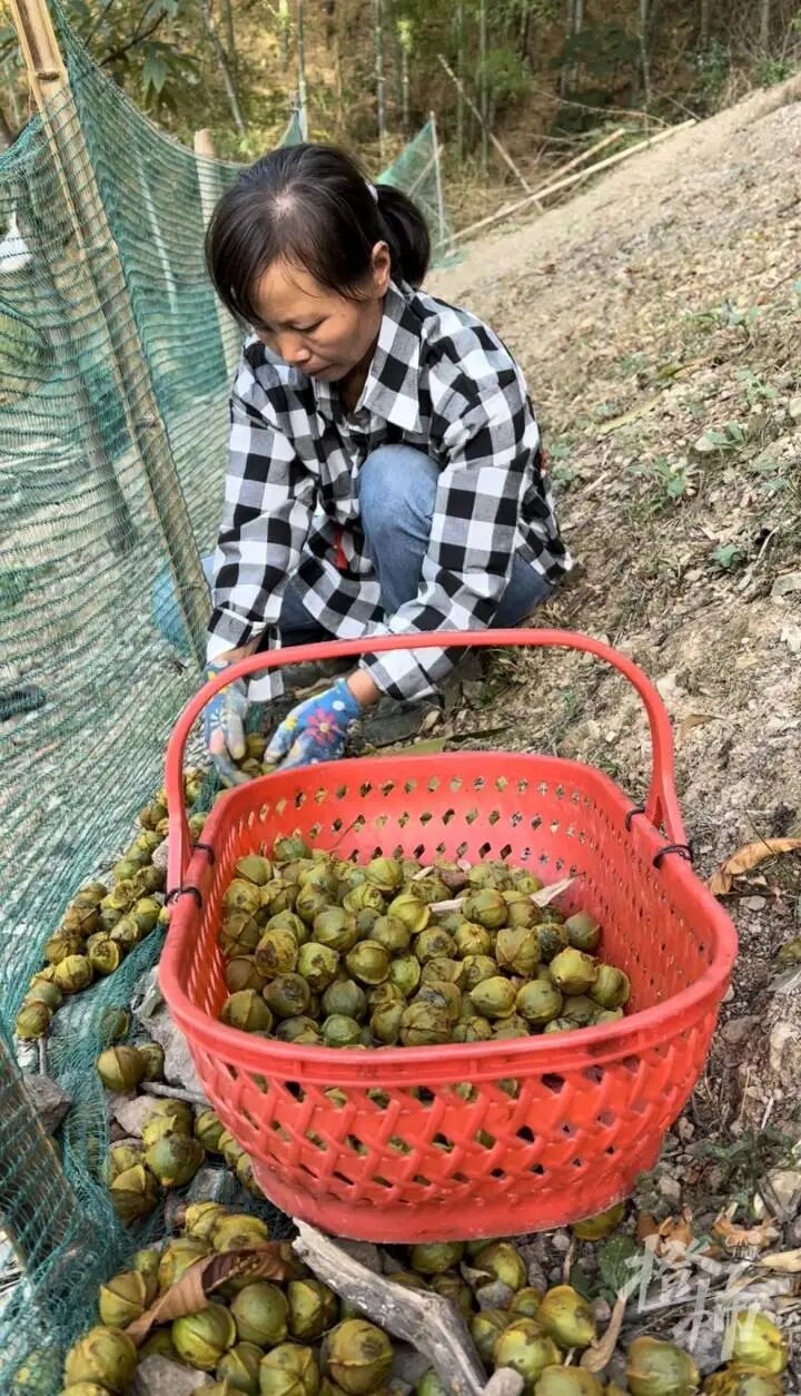 “我在杭城开了家房屋销售、租赁公司,员工五六人。每年白露我都回家打山核桃,临走前就‘向员工请假’,叮嘱他们自己不在,也不能‘摸鱼’。”昨天,赵锡飞在开杆首日就上山捡了一天山核桃,一身工装,全然放下平时的老板派头。