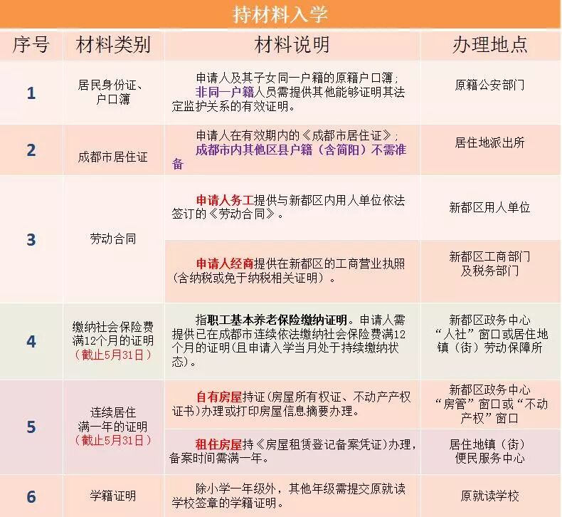 先填报《新都区流动人员随迁子女就学申请表》(在登记点领取哦),准备好下列材料原件,提交复印件: