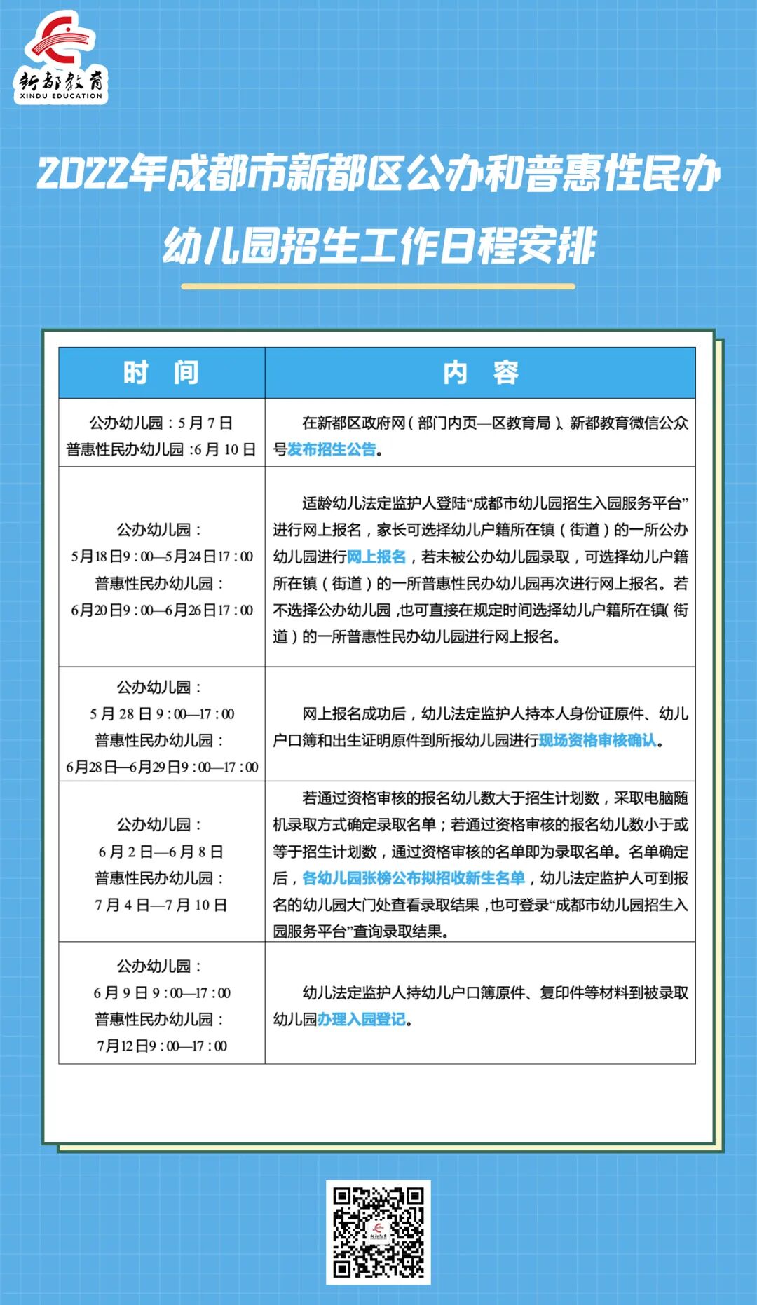 关注微信公众号“新都教育”,5月7日将通过“新都教育”微信公众号发布幼儿园招生公告(幼儿园名称、地址、招生计划等)。