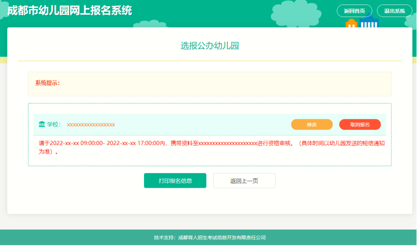 第五步:选报幼儿园后可查看报名信息。在报名时间内,查看报名信息页面可修改和取消报名、打印报名信息。