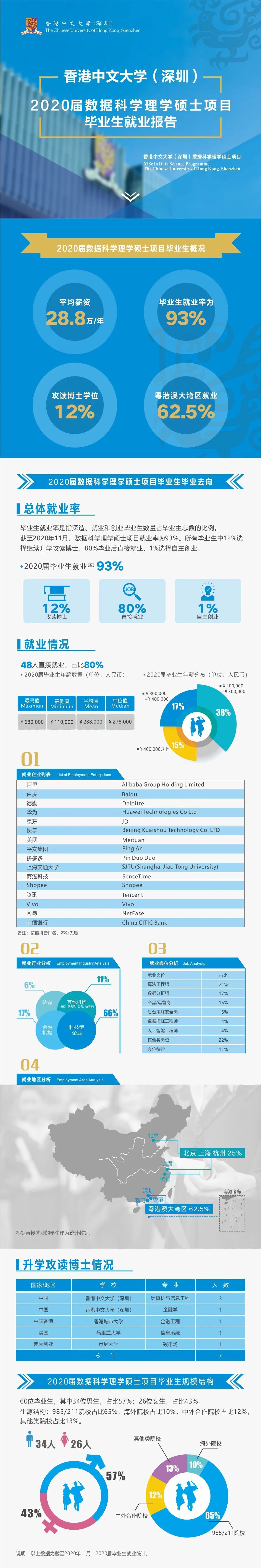 2020年11月30日,香港中文大学(深圳)数据科学理学硕士项目正式发布《2020届数据科学理学硕士项目毕业生就业报告》。数据科学理学硕士项目由香港中文大学(深圳)数据科学学院与经管学院共同开设,并与深圳市大数据研究院和深圳高等金融研究院合作,经过多方资源的整合和项目组师生的努力,数据科学2020届毕业生以优秀的就业成果交出了一份令人欣慰的答卷。
