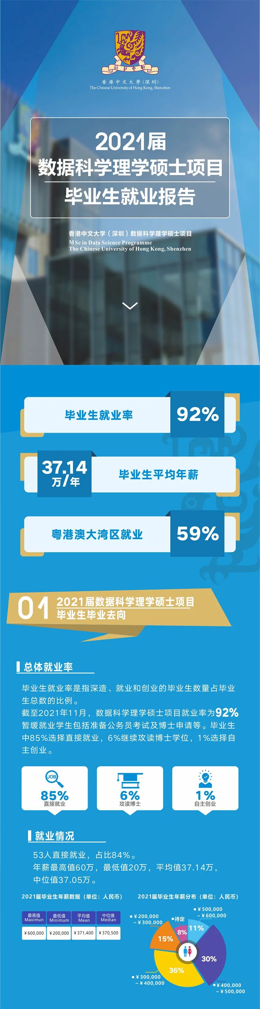 近期,香港中文大学(深圳)数据科学理学硕士项目(MDS)喜讯频传,继今年9月入选ChaseDream 2021-2022数据科学硕士全球排名亚太第二的优异成绩之后,于近日,数据科学硕士项目迎来了新一届毕业生,并发布了2021届数据科学理学硕士(MDS)就业报告。