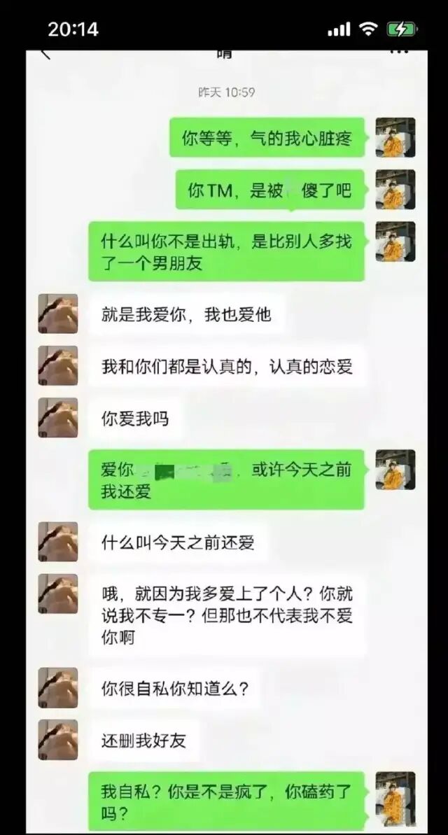 从这里可以看出,男生得知女生出轨以后,十分生气,提出了互删。