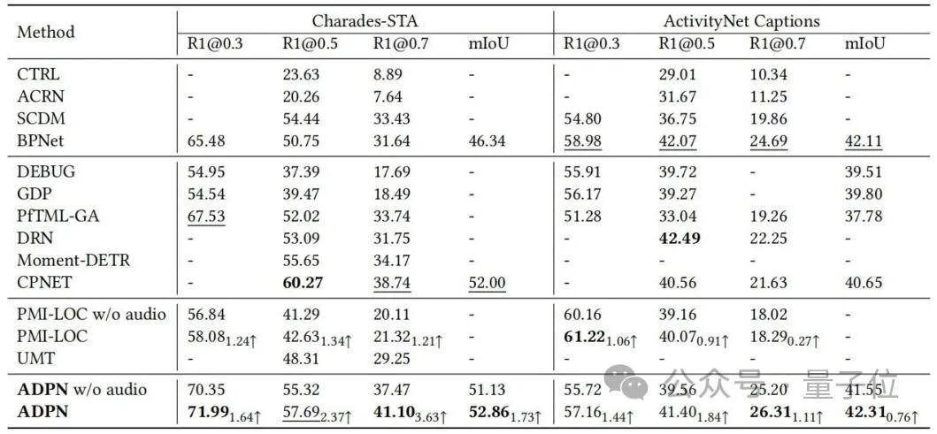 ADPN方法能够取得SOTA性能;特别地,相较其他利用音频的TSG工作PMI-LOC、UMT,ADPN方法从音频模态获取了更显著地性能提升,说明了ADPN方法利用音频模态促进TSG的优越性。