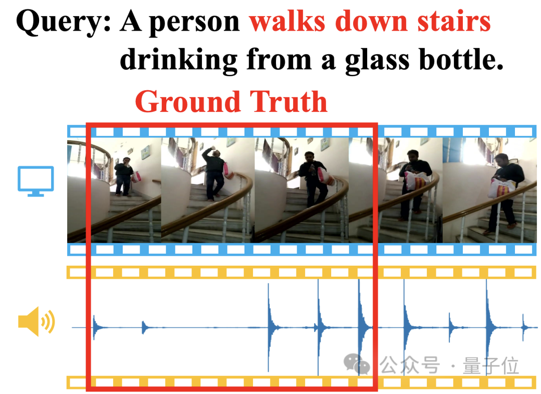 比如描述“一个人一边下楼梯一边喝水”,通过视频画面和脚步声的匹配,新方法一下子就能揪出对应起止时间戳: