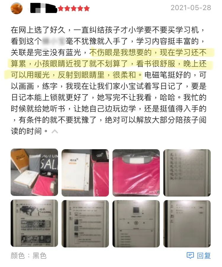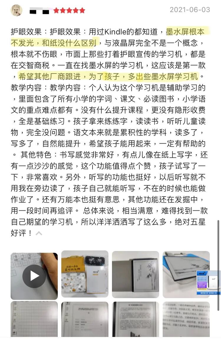 多数的使用评比都反馈了电子墨水屏舒适阅读、不伤眼的优越好处,纷纷给予五星评价!