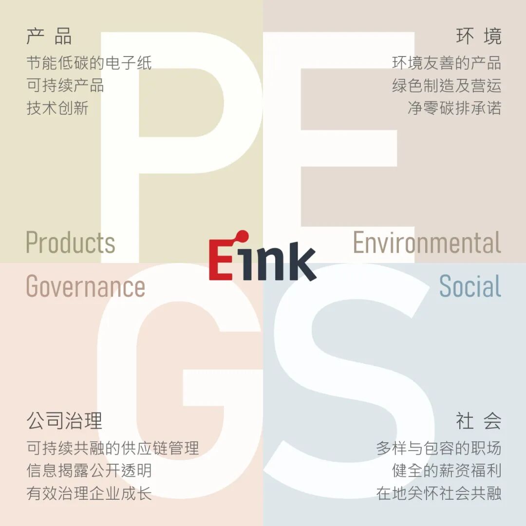 E Ink的电子纸显示技术及产品创新独特,除显示类纸、可呈现动态信息并舒适阅读,却相对较一般电子显示器节能减碳。基于此"生而为环境可持续"的电子纸可持续"产品(Product)"为核心,结合ESG的"环境(Environment)"、"社会(Social)"及"公司治理(Governance)",成为企业可持续的"P、E、S、G"四大构面。