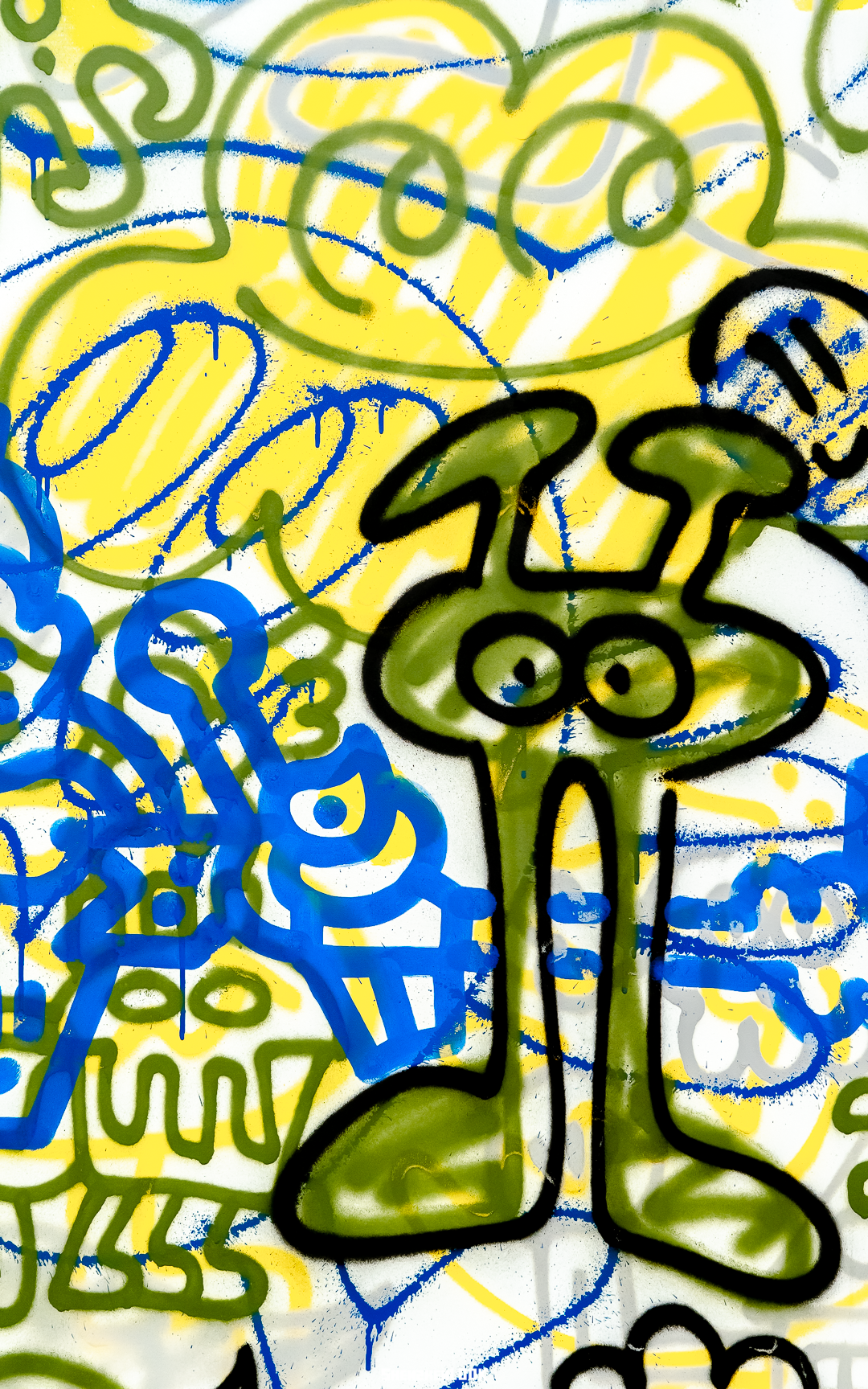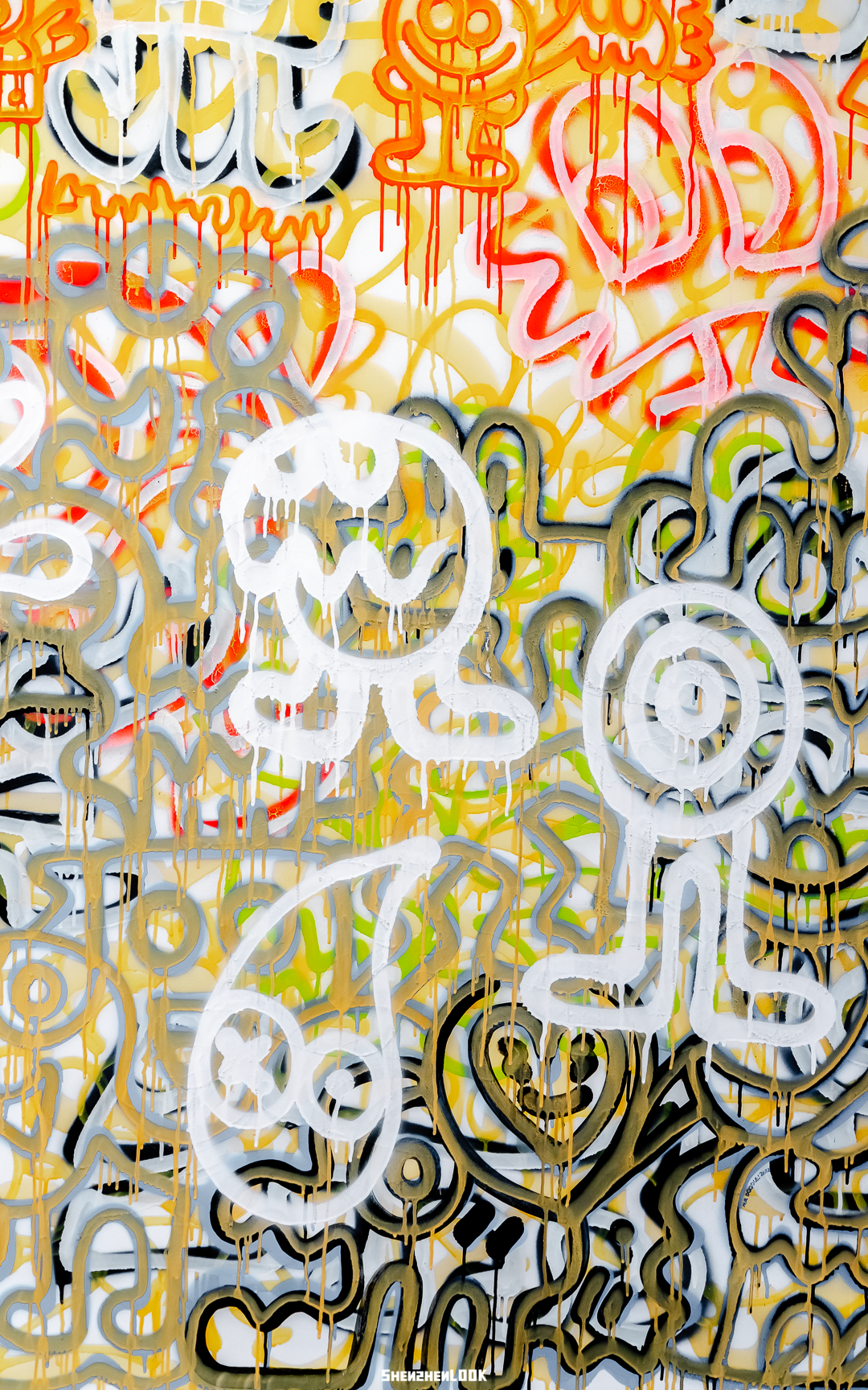 为明黄、鲜橙等暖色调联结的背景,是<沙漠妖怪>的粗犷底色,无数跃然于沙幕之上的大小生物,有着各色的情绪。在画作之上,你能找到多少只“沙漠妖怪”?<街头派对>的画作上,每一层皆有诸多造型,虽重叠生长,却亦能清晰可见,满溢着Mr Doodle的快乐心情。派对上欢脱舞动的精灵们,正放肆欢笑,也准备拉你进入这场游戏。