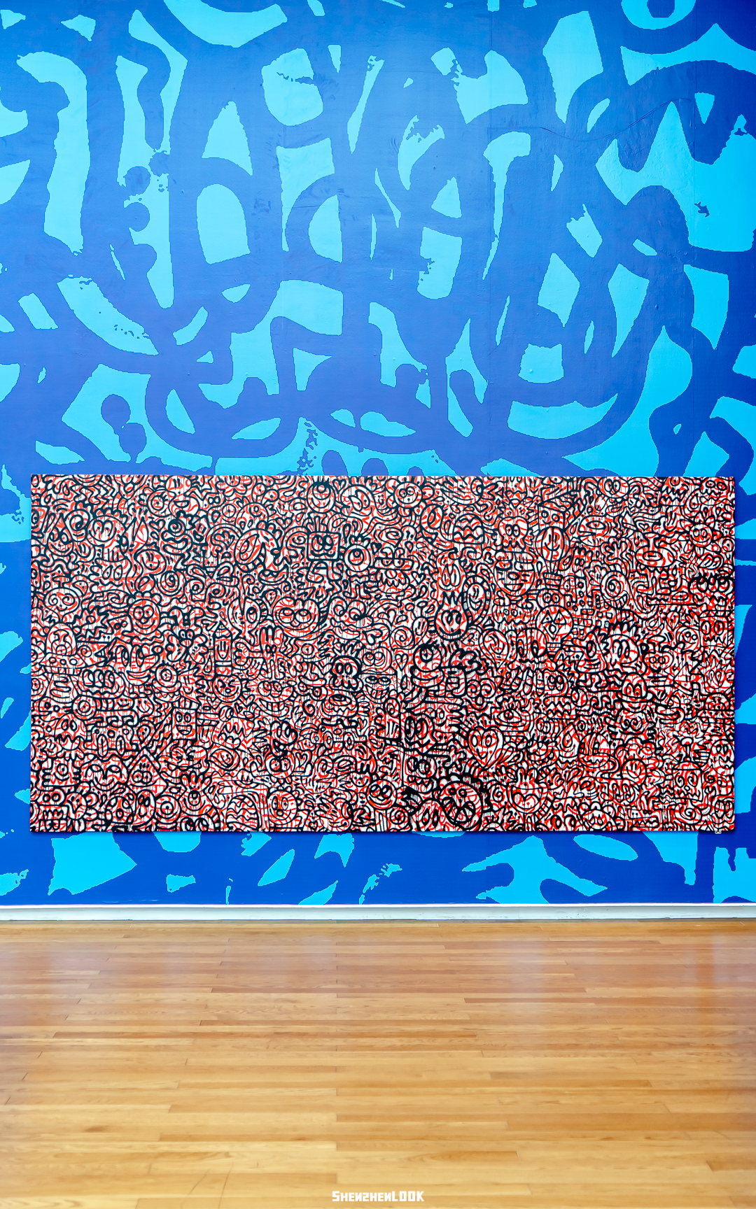 深蓝涂鸦背景墙之上,近4米的<霓虹乌托邦>悬于此,荧光色交织,渲染出一个别样国度。于浓墨重彩中沉浸片刻,跟随异色精灵们遁入他们的家园。