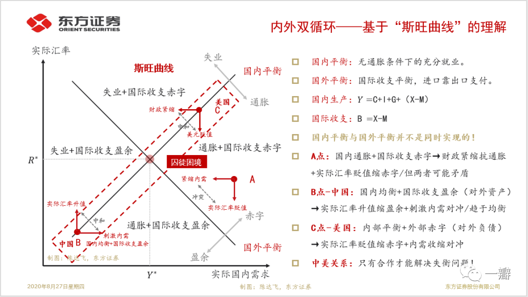 从全球来看,所有循环都是内循环。从国家来看,内外循环互为因果。国民收入账户和“斯旺模型”是分析内循环和外循环,或者内部均衡和外部均衡关系的常用工具[1]。国民收入账户的恒等式关系要求“净借款”——四部门(家庭、企业、政府和世界其它地区)的收入减去支出之和必须为零,这是一般均衡理论中的瓦尔拉斯定律的应用。由此可以得到,国民净储蓄(居民储蓄 - 居民投资)等于资本净流出(对外净投资),后者又与经常账户顺差规模对应。资本流出等价于进口需求,从而导致内需不足。净储蓄、净资本流出和经常账户顺差是等价的,这就是内外循环的嵌套和镜像关系。人们习惯于纠结这背后的因果关系,然而,恒等关系是一个比因果关系更强的约束。任何影响国内储蓄与投资关系的政策,都会映射到国际收支账户。任何扩大投资和储蓄剪刀差的政策,都会加剧经常账户和资本账户的失衡。从这个意义上讲,几乎所有经济政策都会影响一国的经常账户收支状况,甚至包括不健全的《劳动法》和宽松的《环境法》(宽松的环保标准),因为这相当于对可贸易品部门的隐形补贴,降低了其生产成本,增加了投资和产出,而与此同时,又增加了居民的储蓄,降低了消费(佩蒂斯,2014)。国民收入账户的平衡是会计意义上的平衡,任何时候都是成立的,它对于经济是否处于均衡增长路径并未提供任何信息。内部均衡和外部均衡的关系可在“斯旺模型”中表示(图1)。横轴为实际国内需求,等于消费、投资、政府支出和净出口之和,当其与总产出(Y)相等时,就达到了内部均衡。横轴还可以被用来表示政策的刺激力度,越往右,刺激力度越大。纵轴为实际汇率,等于名义汇率乘以国内外价格之比。实际汇率下降表示国内竞争力的提升,这可能是由名义汇率贬值引起的,也可能是由于国内的成本和商品价格相对于国外下降引起的。