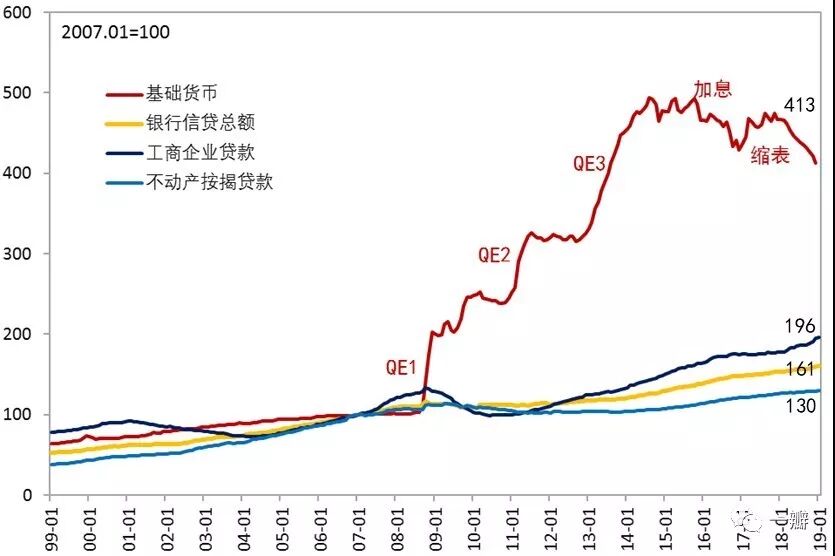图3以美国为利,对比了金融危机前后,基础货币于银行信贷的关系。在危机之前,走势基本一致(除了工商企业贷款出现小幅波动之外)。但危机之后,基础货币和银行信贷的图景出现了较大差别。3轮量化宽松逐渐将基础货币(其变化主要是超额准备金引起的)推向历史高位,但银行信贷却出现了萎缩。其中,相比于2007年1月(=100),截至2010年12月,工商企业贷款余额仍未达到危机前的水平。而针对居民部门的不动产按揭贷款,众所周知,它是引发金融危机的底层负债,从而也成为资产负债表修复最缓慢的环节,直到2015年8月,指数仍维持在110以下(危机之后有一段时间的超过110,而后又开始下降)。
