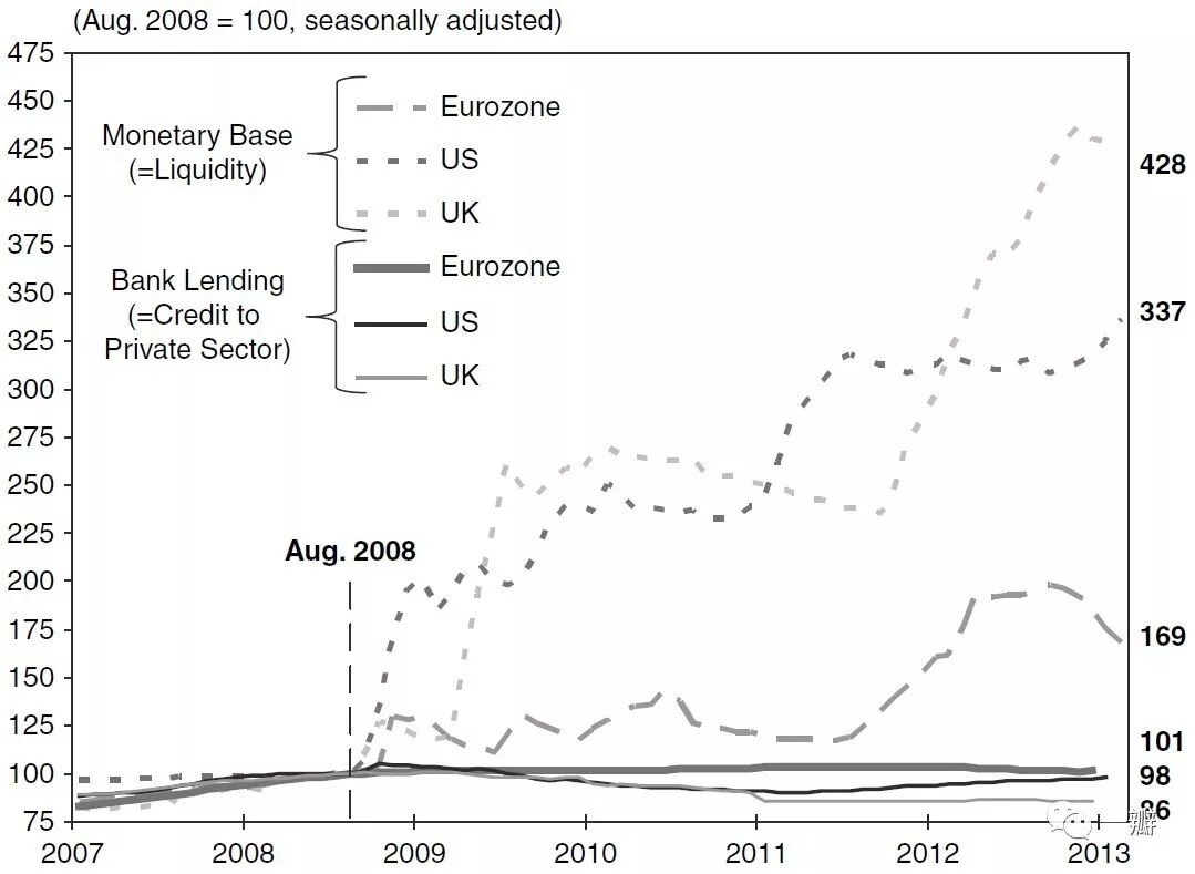 我们可以将货币的派生分成两个环节:央行基本可以决定的基础货币;和商业银行体系创造的货币。央行通过实施量化宽松政策,增加了基础货币的供应,在传统教科书理论中,便可以通过货币乘数,变为广义货币供给。但在货币内生的情况下,货币乘数发挥作用的前提条件是私人部门的货币需求是充分的。但在资产负债表衰退时期,私人部门的目标函数转变为债务最小化,即使是在零利率的情况下,货币需求仍然不足,从而导致货币创造机制中断。这一点可以从图2中得到论证。图2对比了美国、欧元区和英国在实施量化宽松之后,基础货币和私人部门的信贷的变化,前者可以看作是央行决定的供给侧,后者则取决于实体部门的需求侧。很显然,出现了供给侧过剩,和需求侧不足的现象。以2008年8月为起点,到2013年初,英国、美国和欧元区的基础货币分别增加了3.28、2.37和0.69倍,但私人部门信贷除了欧元区基本持平外,英国和美国反而出现了收缩。这里既可以反映出美国和英国的资产负债表衰退的程度要相对严重,也可以部分说明欧洲央行行动迟缓的合理性。