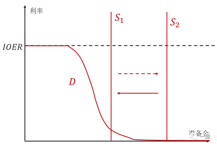 这种变化,使得联邦基金市场出现了结构性变化,如图2所示。IOER变为利率走廊的上限,下限为零,供给曲线右移,与利率走廊下限相交,表示流动性过剩。