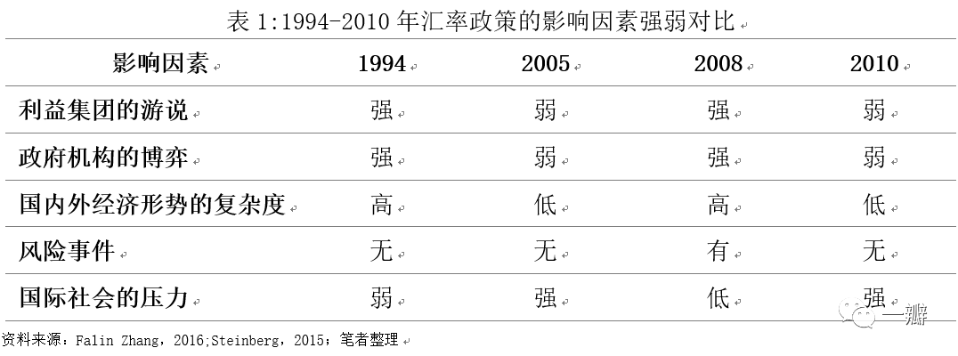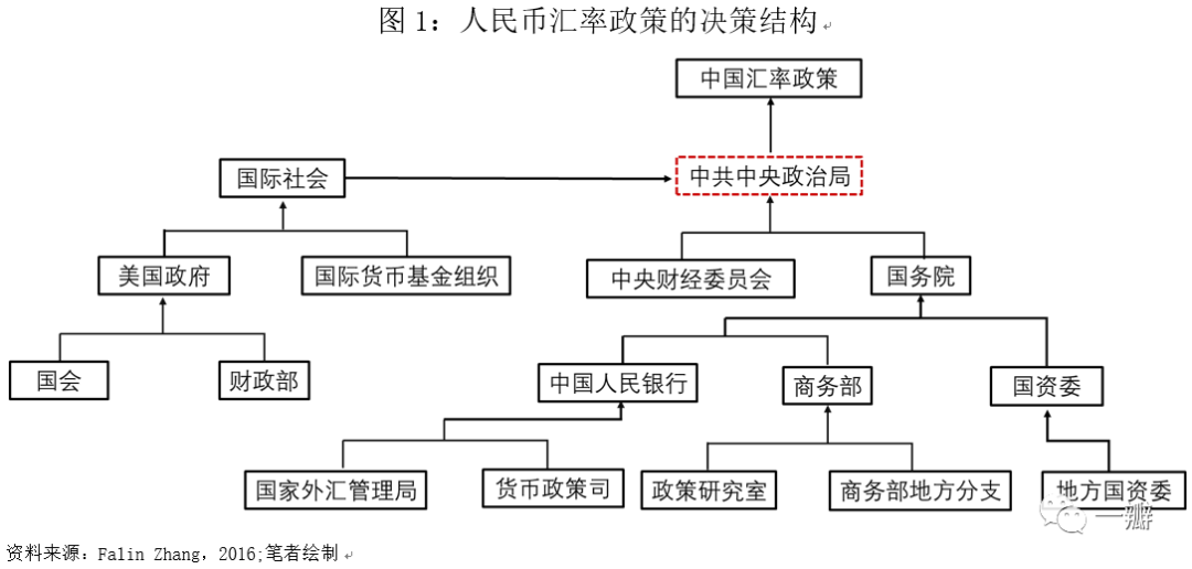 在人民币汇率市场化改革目标既定的情况下,人民币汇率政策背后的政治和经济逻辑是什么?本文从5个维度进行分析。不同时期,各因素影响力有差异,但主因都是内因。分离市场的力量,政治在决定人民币汇率制度改革和汇率升、贬值方向上扮演什么角色?我们可以将决定人民币汇率的因素分为市场力量和非市场力量。前者决定均衡汇率,两者共同导致实际汇率对均衡汇率的偏离度和偏离时长。非市场力量当中,最为重要的因素就是政治制度。如凯恩斯爵士的知名格言:长期而言,我们都死了。对于投资者来说,时点和短期趋势的判断可能才是决定他们拿多少年终奖的关键。这在很大程度上取决于政治和经济利益集团的角力,以及国内外经济形势变化。本文着眼于人民币汇率决策的过程,尝试提出一个一般性的分析框架,揭示自1994年汇率并轨改革至2015年“8•11汇改”这21年间人民币兑美元单边升值区间中,人民币汇率走势背后的博弈。在中国加入WTO之前,国际社会对人民币汇率的估值问题讨论的比较少,但此后不绝于耳,因为汇率高估或低估不只是会引起国内利益的分配,也会引起全球利益的分配。美国最早于2003年9月开始对人民币施加压力,认为中国刻意低估人民币汇率,为出口导向型的政策目标服务。为此,美国国会议员提议向中国加征27.5%的关税,这被认为是人民币低估的程度。2008年金融危机发生之后,人民币汇率低估问题受到更为广泛的关注,并有观点认为,这是造成全球失衡、西方国家利率下行和风险资产价格泡沫的重要原因(Obstfeld & Rogoff, 2009)。均衡汇率是个纯粹的经济理论概念,现实中并不存在,所以需要估算,通过考察实际汇率对它的偏离度,判断高估或低估。如果实际汇率高于均衡汇率,则是高估,反之为低估。对人民币汇率低估程度的评估随方法而异,2005年之前的结果基本分布在10%-35%之间。如Jeffrey Frankel(2004)运用购买力平价的方法估算,认为人民币被低估了36%。齐建国和彭绪庶以1995年为基期,采用一般均衡方法估算,认为人民币被低估了10%-15%。威廉森(John Williamson,2003)的结果是人民币被低估了20%-25%。Bond等(2004)的结果是人民币低估了20%。根据协定条款,IMF负责对成员国的经济金融政策进行评估。自1997年开始,IMF汇率问题咨询小组对成员国实施的汇率评估,频率为一年两次,其评估方法在不断更新,2006年以来采用的方法包括宏观平衡法、均衡实际汇率法和外部可持续性法,统称为基于经常账户余额的汇率评估方法。由于回归方法存在一些缺陷,IMF在2012年提出了新的方法——外部平衡评估法(张明,2012)。不同方法估算的结果存在一定的差异,但基本都认为人民币存在一定程度的低估。IMF(2005)的定性结果是“显著低估”,2010年的结果是“低估”,2015年的评估结果变为“不再低估”。Steinberg(2015)计算了1993-2007年人民币汇率对均衡汇率的偏离水平,计算期内平均低估38%。不同时期,程度略有差异。低估程度最高的时候是1994年汇率并轨时期,接近50%,而后随着人民币有效汇率指数的上升,人民币汇率低估程度不断下降。本文更为关心的是,既然1994年并轨时人民币已经低估,为何还要将官方汇率5.8并至外汇调剂汇率8.3,而非相反?以及在之后的历次汇率调整中,哪些力量左右了人民币汇率的方向和升贬值幅度?我们认为,这关键是要厘清汇率低估的受益者和受损者。理论上而言,汇率低估虽然会增强其出口商品的竞争力,但它同样也会提高进口的中间品的成本,特别是对于中国这种进口中间品依赖度高的国家。Koopman等(2012)计算的结果显示,进口的中间品占中国出口增加值的比重近50%。但是,这些成本都可以转嫁到金融部门和居民部门,原因在于政府对于金融资源的垄断和劳动市场的管制,前者体现在国有商业银行的寡头垄断地位,后者体现为劳动者权利在法律上的缺位。成本转嫁的方式就是金融抑制,控制正规金融机构的贷款利率,压低存款利率,最终受损的还是储户。转嫁的成本并未消失,其负面效应之一就是多年来的消费不足。除此之外,保持汇率低估所要求的冲销(sterilization)操作还会抬升国内的利率水平(Reinhart and Reinhart,1998),提高企业的融资成本,因为被动的冲销式购汇将导致货币的被动投放,从而引发通胀和名义利率的抬升。所以,此处需要探讨的问题就是,宏观政策的目标函数是什么,全社会的福利最大化?还是如戈登•塔洛克在《官僚体制中的政治》中用亚当•斯密的口吻所说的:“我们所需要的研究经费或福利支票,并非得自官员的恩惠,而是得自他对自己利益而非公众利益的计算,”决策者的政策立场完全取决于其个人和所代表的政治和经济利益团体的理性计算?重要政策多少都带有分配效应,探讨人民币汇率政策的决策问题,绕不开政治和体制。人民币汇率政策的决策结构如图1所示。箭头指决策的流程。![]()