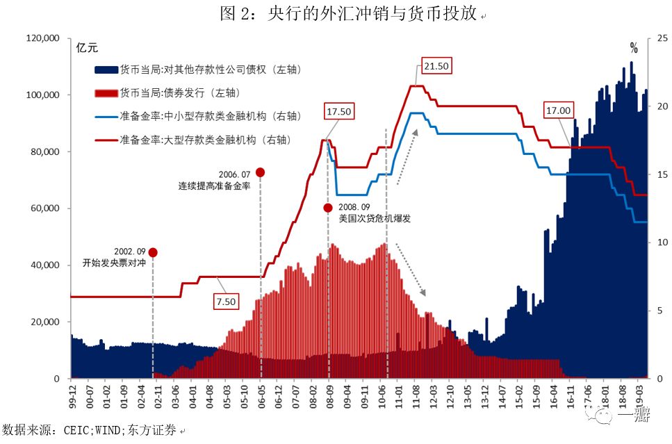 1994年汇率并轨,到底是向官方汇率并(升值),还是向外汇调剂市场汇率并(贬值),在决策层出现了分歧。最终结果是人民币官方汇率贬值,由5.8贬至8.7,一次性贬值50%,与外汇调剂市场汇率并轨。Steinberg(2015,p.95)认为,制造业的利益诉求是核心原因。1992年开始,国内经济开始出现过热现象,通货膨胀率不断上升。1993年1月CPI同比便超过10%,而后一路上行。时任副总理兼央行行长的朱镕基制定了“16条”宏观紧缩政策,包括货币紧缩,以抑制通货膨胀,在汇率并轨问题上,也主张升值。但是,紧缩性政策损害了制造业部门的利益,经常账户在1993年出现逆差。以沿海省市为代表,他们公开支持人民币贬值。外国投资者也支持人民币贬值,因为这会降低劳动力和融资的外币价值。1994年汇率贬值并未受到国际社会的广泛关注。此时正值冷战之后的“大缓和”时期,中国尚未加入WTO,所以主要影响因素是国内。有意思的是,国内的紧缩政策与汇率的贬值可以看作是一个互补的政策组合,是一种权衡与补偿。它常见于宏观政策之中,或许可以看作是“政策的艺术”。2005年汇改,人民币一次性升值2.1%,随后开启单边升值走势,表面上是改革派的胜利,但实际上仍是一个折衷方案。俗话说,修葺屋顶最好选在天气晴朗而非刮风下雨之时,2005年“7•21汇改”也是这个道理。2002年,周小川被任命为央行行长,受过西方教育的央行技术官僚在金融制度建设上持比较一致的观点,大多坚持市场化的方向。周小川被称为“人民币先生”(Mr. RMB),表现之一就在于推动汇率制度改革和人民币国际化之上。我们认为,2005年“7•21汇改”的迫切性和遇到的阻力都没有1994年汇改那么明显。利益集团的压力之所以较弱,原因在于:第一,加入WTO之后,经常账户顺差不断创新高;第二,时任国家总理的温家宝提出了汇改的三原则:自主、可控与渐进。汇改后的前两年半,人民币兑美元汇率仅从8.28升到2007年底的7.37,升值11%。第三,还有其他补偿性政策,如提高出口退税率。以纺织业为例,“7•21汇改”后,行业增加值同比增速仍维持在20%的高位。所以,央行与商务部的冲突,也并没有1994年那么显著。反而是连续的“双顺差”引发了国际社会的关注和压力。首先是IMF(2005)评估称人民币“显著低估”,其次是美国国会自2003年开始就向中国施压。2008年9月,雷曼破产引发全球金融海啸。为应对经济的不确定性,人民币重新盯住美元(6.83元人民币/美元),汇率市场化改革暂时让位于稳增长和防风险,但外因并非故事全貌。首先,前期人民币持续升值挤压了出口行业的利润,2005汇改至2007年底,人民币兑美元仅升值11%,但2008年的前9个月,人民币升值5.4%,截至2008年8月,人民币兑美元共升值17.5%。其次,补偿性措施效用下降。2005年之后,中国多次削减出口退税率,迫使出口行业退出低成本和已经饱和的行业,政策重点转向抑制贸易顺差和促进产业结构升级上;第三,金融危机引发外需下降,直接影响出口部门。所以,制造业部门的利益诉求,也是汇改暂停的一个原因(Falin Zhang,2016;Steinberg,2015)。时隔不到两年,2010年6月19日,央行宣布继续推进人民币汇率制度改革,放弃盯住美元。这超出了IMF的预期,因为在2010年上半年的评估中,人民币的汇率水平已经从“显著低估”转变为“低估”。此时国际社会的压力主要来自美国,学术界对人民币汇率也进行了广泛的讨论,认为汇率低估是导致中国长期双顺差和全球经济和金融失衡的一个重要原因。但是,本次放弃盯住美元的主要力量仍然来自内部。2010年4月,商务部对人民币汇率升值进行了压力测试,认为对于家用设备、汽车和手机行业而言,升值3%会导致利润下降30%-50%,主张盯住美元的安排再延长2-3年。此次政策天平偏向了央行的改革派。一方面,自金融危机发生后的10个月内,出口退税率连续7次上调,这已经是对出口制造业部门的补偿;另一方面,则是来自央行的坚持。2008年底,国内推出了“4万亿”财政刺激计划,通胀压力开始上行。与此同时,“双顺差”不断扩大,不仅增加了央行对冲的任务和成本,还进一步增加了货币投放的压力,迫使央行采取发行央票和提高准备金等多种方式来应对(如图2所示)。但是,通货膨胀率仍在一路上行。与此同时,到2010年年中,美国经济企稳,国际环境相对改善。这一系列因素促使汇率制度改革回归既定轨道。![]()