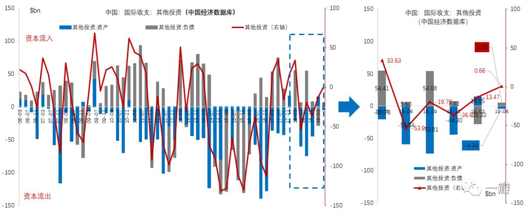 一个非常有意思,也是值得厘清的问题是,细心的读者可能会发现,国内和国外学术文献对资本流入和流出的描述可能存在一定的矛盾,而这种矛盾,同时也体现在CEIC数据库的不同子库中。张明(2019)采取的就是正值为流入,负值会流出的原理。把这个问题讲清楚,对于本专题后续的内容至关重要。我们先来对比图3和图4。这两张图的数据都来源于CEIC,原始数据均来源于IMF,变量均为国际收支账户中的金融账户-其他投资子科目,包括资产项、负债项、和净额。从净额的变化趋势看,两幅图正好相反。这种镜像关系从各自右边的缩放图中看得更清楚,它显示的是自2018年第1季度以来的6个季度的变化。其他投资净额呈现镜像关系,对应时间,数值绝对值相等,但方向相反。那么,到底是资本流入还是流出?![]()