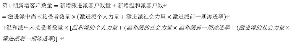 𝑛𝑡为第t期的新增接受人数;𝑀为潜在接受人数,包括激进派(𝑀1)和温和派(𝑀2)。公式(9)表示的是新产品在创新激进派中的扩散,形式和逻辑上等价于公式(5),但参数不一样,故用下角标作了区分;公式(10)表达的是产品在创新温和派中的扩散,相比于公式(9)而言,多了一项内容( 𝑞12*𝑁1𝑡−1/𝑀1),表示的是激进派对温和派的示范效应,参数𝑞12表示跨派别社会力量参数,𝑁1𝑡−1/𝑀1表示产品在激进派中的渗透率。如果想要表示没有跨派别社会影响,只需要将𝑞12设为0即可。那么,用文字可描述为:![]()